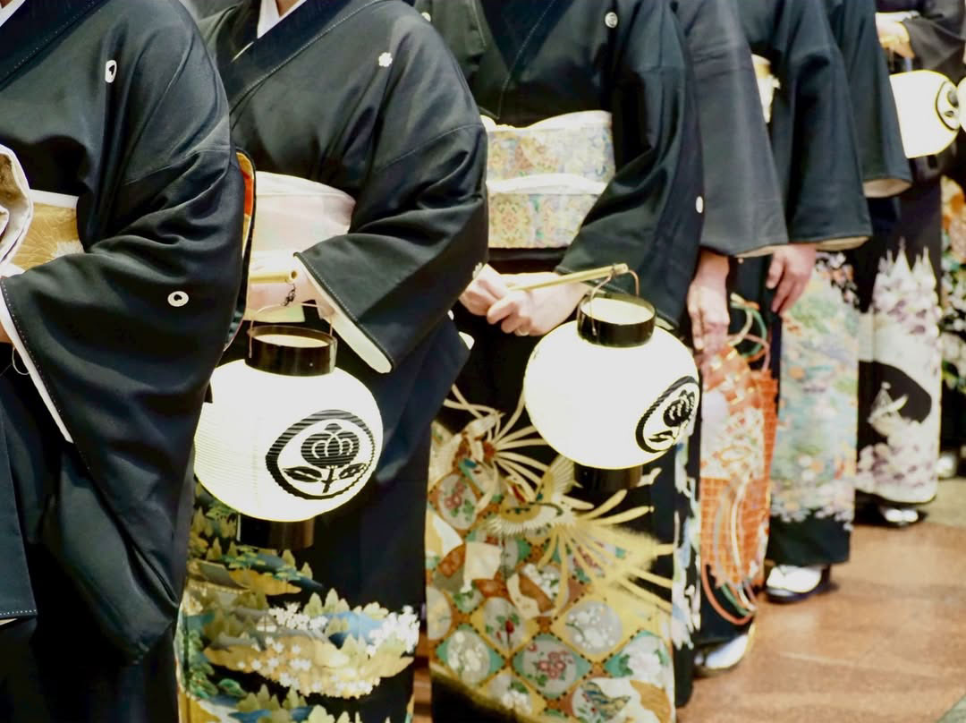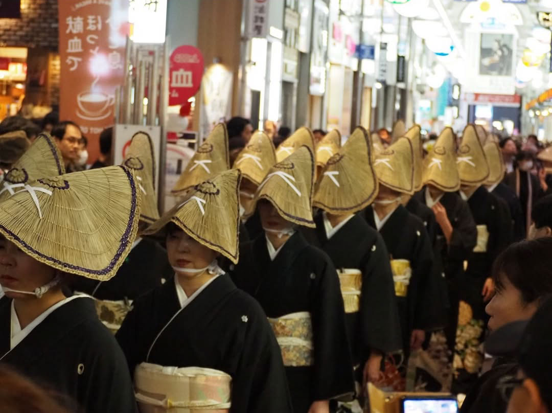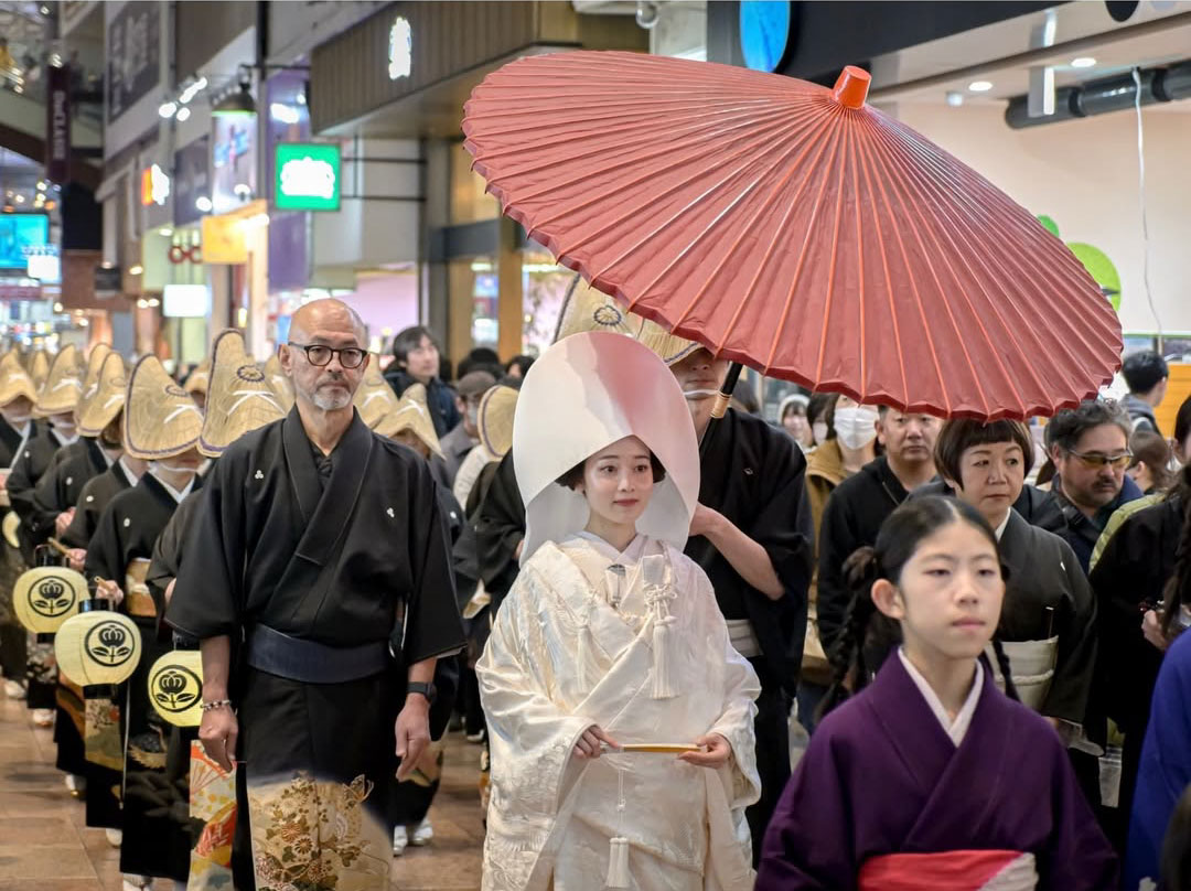 黒留袖に身を包んだ参列者たちが「狐の嫁取り」の物語に沿って街を進み、まるで絵巻物から抜け出したかのような幻想的な光景が広がります。