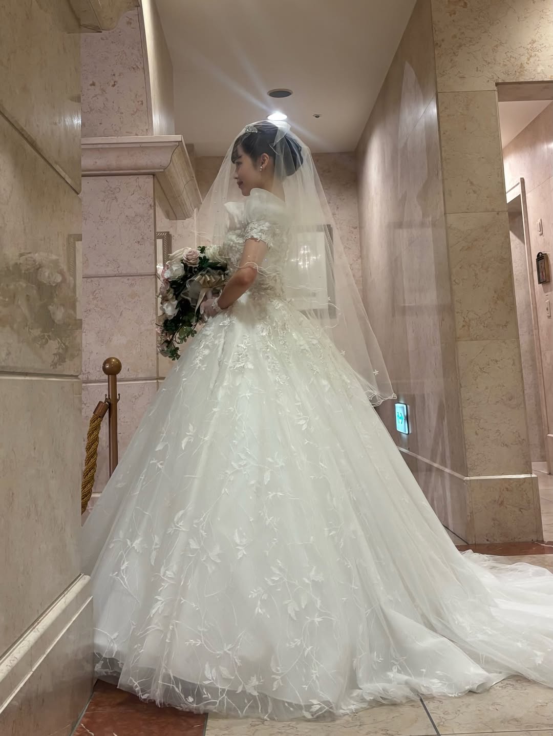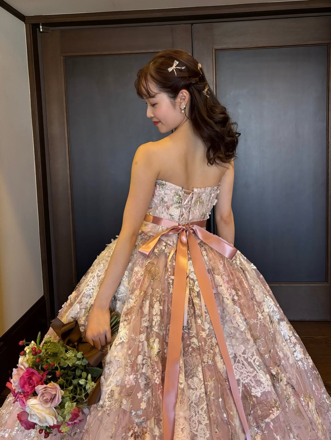 挙式ではディズニープリンセスのようなウエディングドレス、披露宴ではお花が散りばめられたピンク色のカラードレスを着用させていただきました。