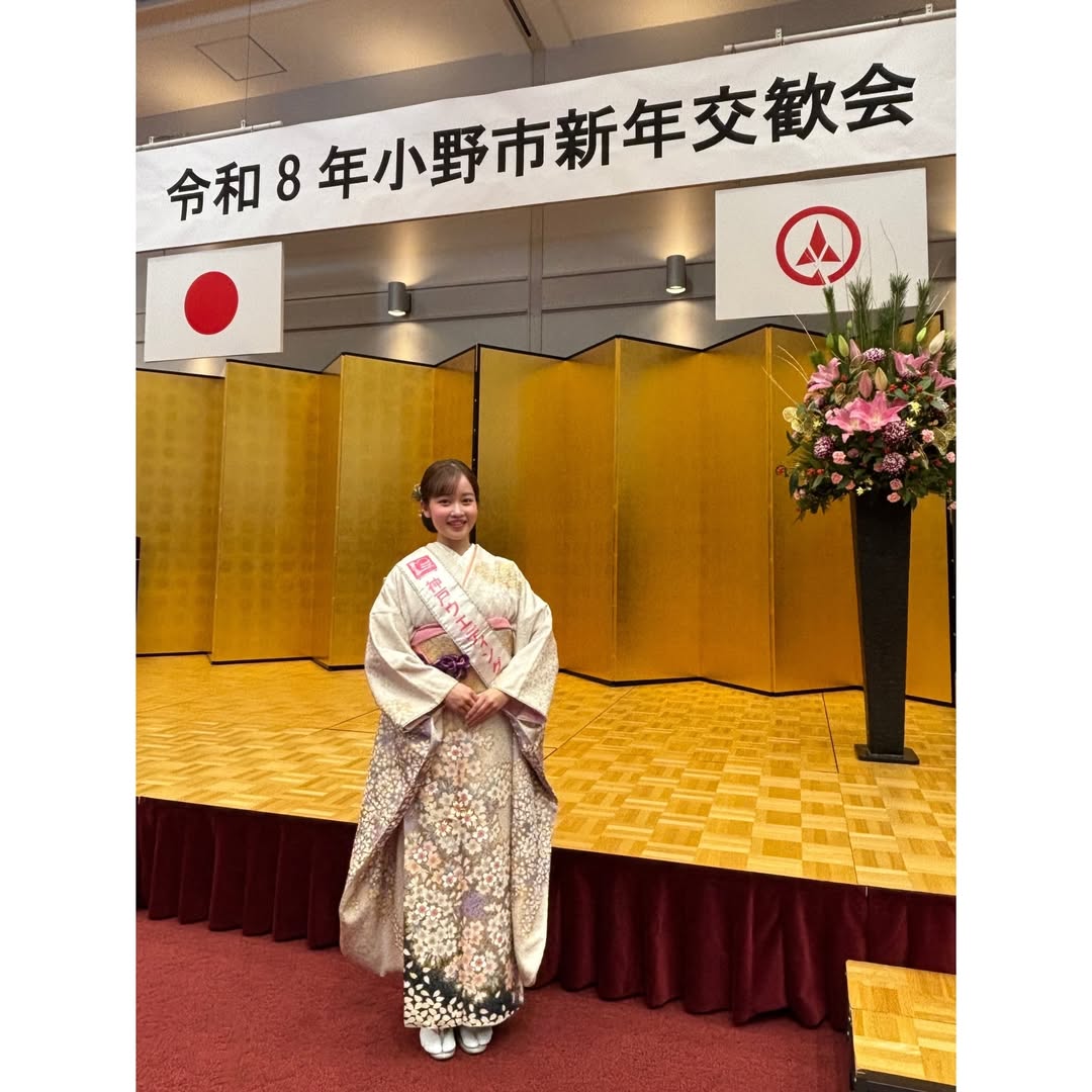 2026/01/05 令和8年小野市新年交歓会 2026年1月5日(月) 令和8年の小野市新年交歓会に、第15代神戸ウエディングクイーンの梶尾綾が参加させていただきました。 小野まつり、タクミナリエに続いて新年をお祝いをする場に振袖を着て参加。 ご紹介の際には、アナと雪の女王より「生まれてはじめて」を小野市バージョンに替え歌をして披露させていただきました。